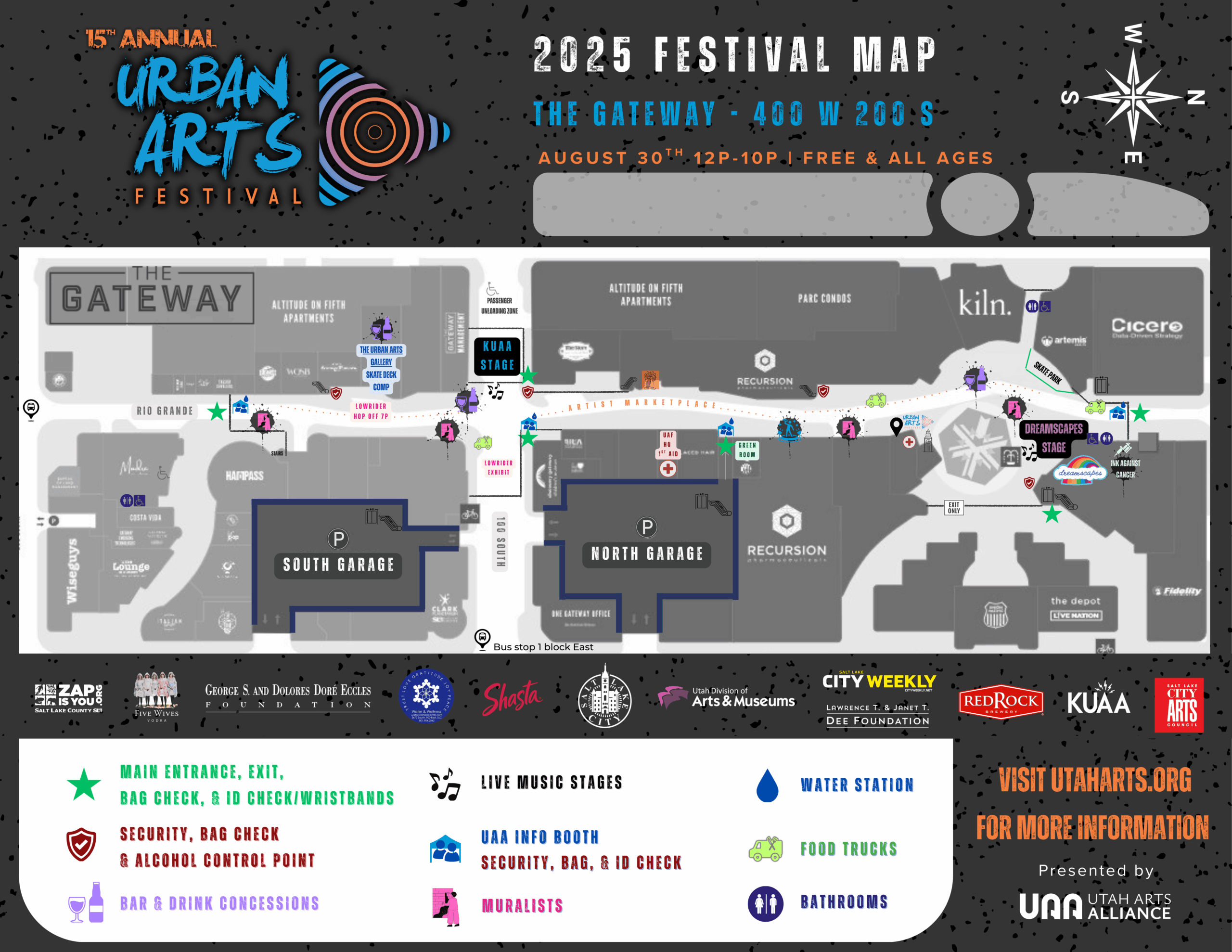 Where can I park at Urban Arts Festival? The Gateway has two underground parking garages located on 100 S and 400 W. There is also limited street parking.